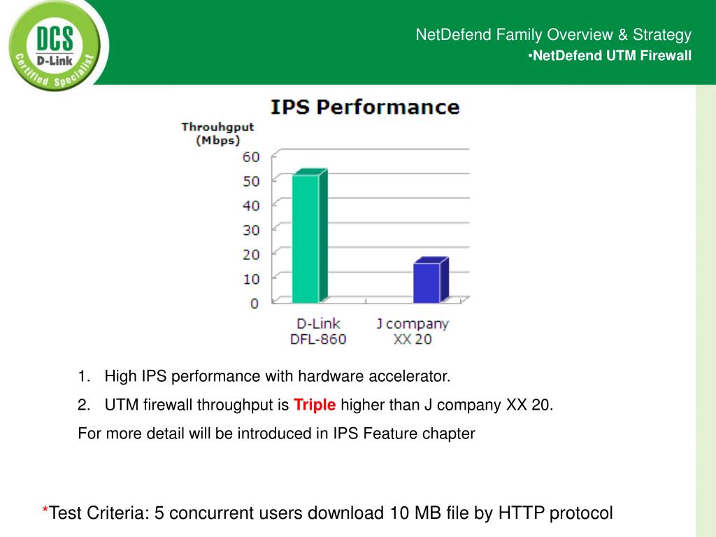 NetDefend Family Overview & Strategy NetDefend UTM Firewall • High IPS performance with hardware accelerator. • UTM firewall throughput is Triple higher than J company XX 20. • For more detail will be introduced in IPS Feature chapter *Test Criteria: 5 concurrent users download 10 MB file by HTTP protocol