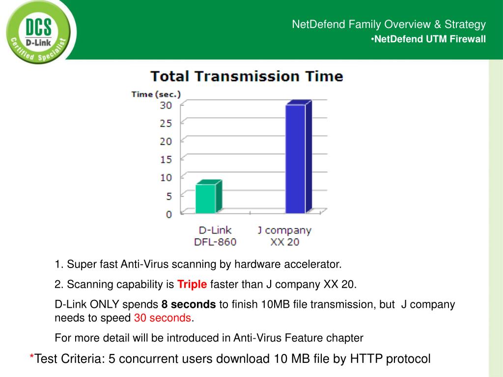 NetDefend Family Overview & Strategy NetDefend UTM Firewall • Super fast Anti-Virus scanning by hardware accelerator. • Scanning capability is Triple faster than J company XX 20. • D-Link ONLY spends 8 seconds to finish 10MB file transmission, but J company needs to speed 30 seconds. • For more detail will be introduced in Anti-Virus Feature chapter *Test Criteria: 5 concurrent users download 10 MB file by HTTP protocol