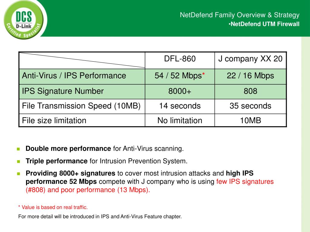 NetDefend Family Overview & Strategy NetDefend UTM Firewall • Double more performance for Anti-Virus scanning. • Triple performance for Intrusion Prevention System. • Providing 8000+ signatures to cover most intrusion attacks and high IPS performance 52 Mbps compete with J company who is using few IPS signatures (#808) and poor performance (13 Mbps). * Value is based on real traffic. For more detail will be introduced in IPS and Anti-Virus Feature chapter.