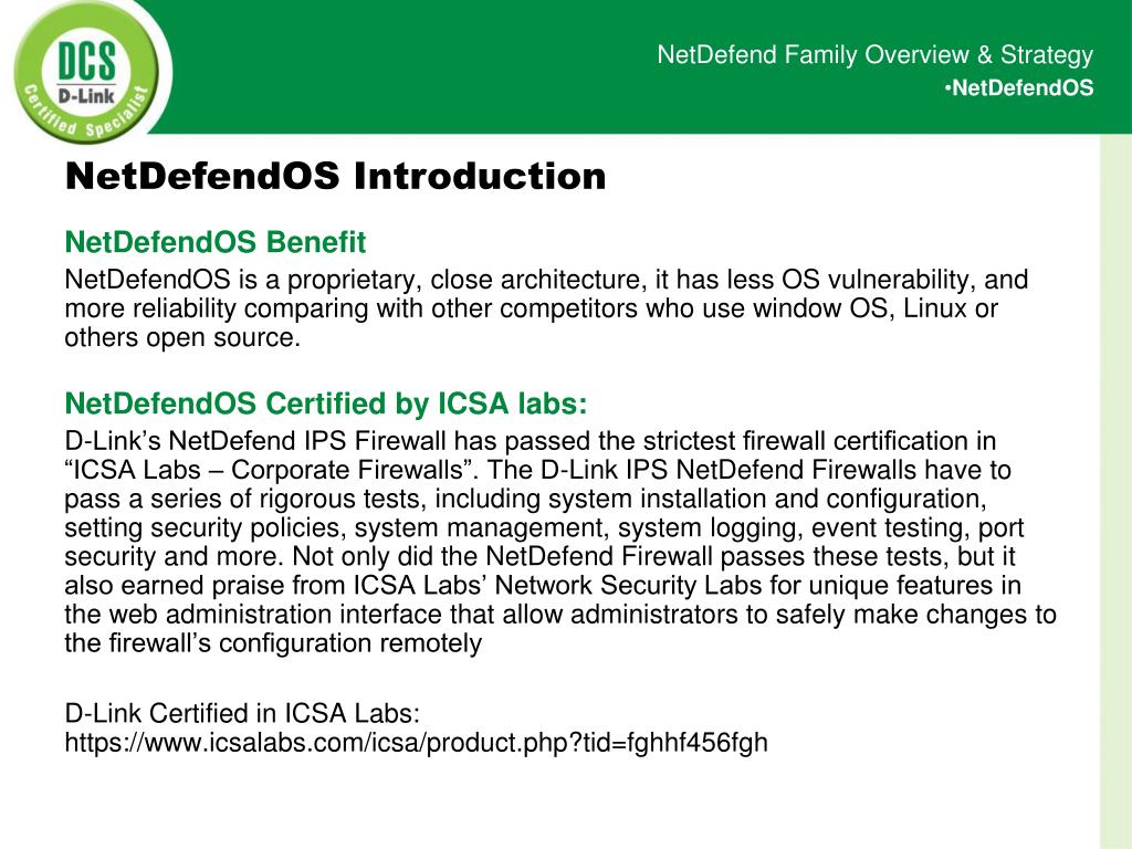 NetDefend Family Overview & Strategy NetDefendOS NetDefendOS Introduction NetDefendOS Benefit NetDefendOSis a proprietary, close architecture, it has less OS vulnerability, and more reliability comparing with other competitors who use window OS, Linux or others open source. NetDefendOS Certified by ICSA labs: D-Link’s NetDefend IPS Firewall has passed the strictest firewall certification in “ICSA Labs – Corporate Firewalls”. The D-Link IPS NetDefend Firewalls have to pass a series of rigorous tests, including system installation and configuration, setting security policies, system management, system logging, event testing, port security and more. Not only did the NetDefend Firewall passes these tests, but it also earned praise from ICSA Labs’ Network Security Labs for unique features in the web administration interface that allow administrators to safely make changes to the firewall’s configuration remotely D-Link Certified in ICSA Labs: https://www.icsalabs.com/icsa/product.php?tid=fghhf456fgh