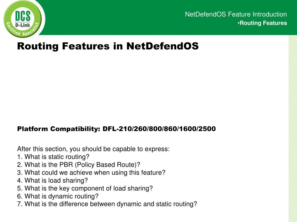 Routing Features in NetDefendOS NetDefendOS Feature Introduction Routing Features Platform Compatibility: DFL-210/260/800/860/1600/2500 After this section, you should be capable to express: 1. What is static routing? 2. What is the PBR (Policy Based Route)? 3. What could we achieve when using this feature? 4. What is load sharing? 5. What is the key component of load sharing? 6. What is dynamic routing? 7. What is the difference between dynamic and static routing?