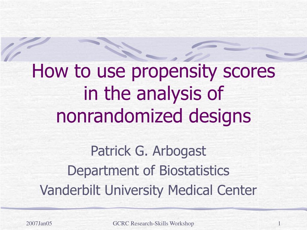 How to use propensity scores in the analysis of nonrandomized designs Patrick G. Arbogast Department of Biostatistics Vanderbilt University Medical Center GCRC Research-Skills Workshop