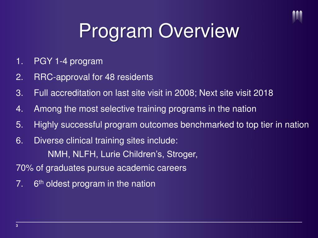 Program Overview • PGY 1-4 program • RRC-approval for 48 residents • Full accreditation on last site visit in 2008; Next site visit 2018 • Among the most selective training programs in the nation • Highly successful program outcomes benchmarked to top tier in nation • Diverse clinical training sites include: NMH, NLFH, Lurie Children’s, Stroger, 70% of graduates pursue academic careers • 6th oldest program in the nation