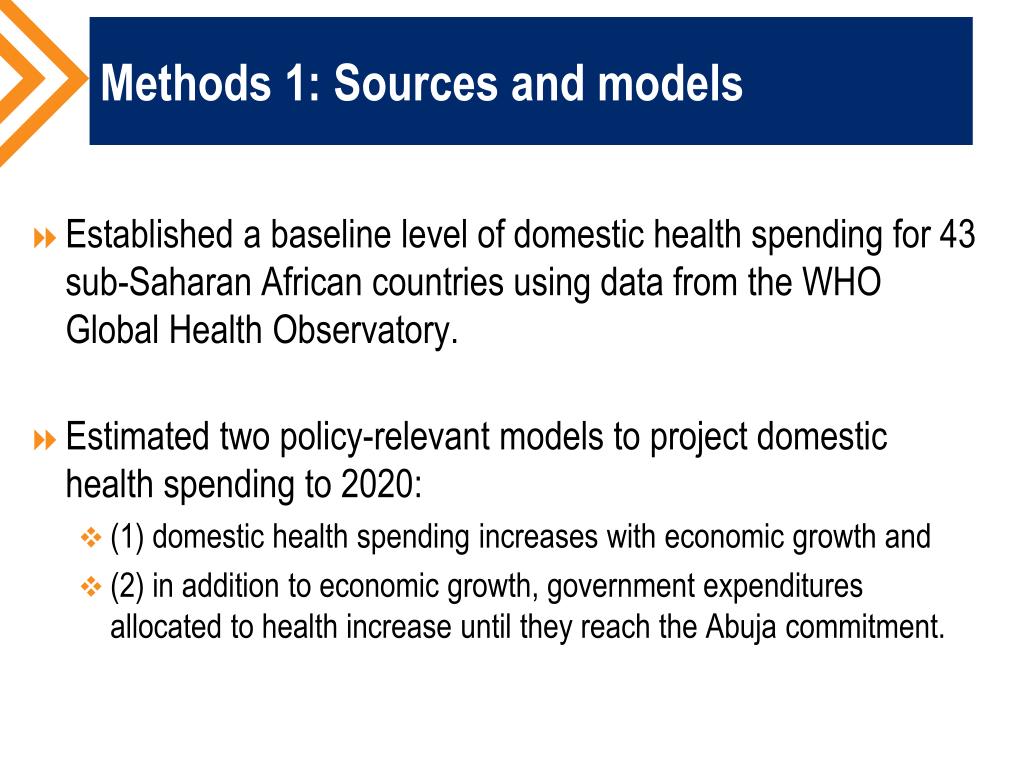 Methods 1: Sources and models • Established a baseline level of domestic health spending for 43 sub-Saharan African countries using data from the WHO Global Health Observatory. • Estimated two policy-relevant models to project domestic health spending to 2020: • (1) domestic health spending increases with economic growth and • (2) in addition to economic growth, government expenditures allocated to health increase until they reach the Abuja commitment.