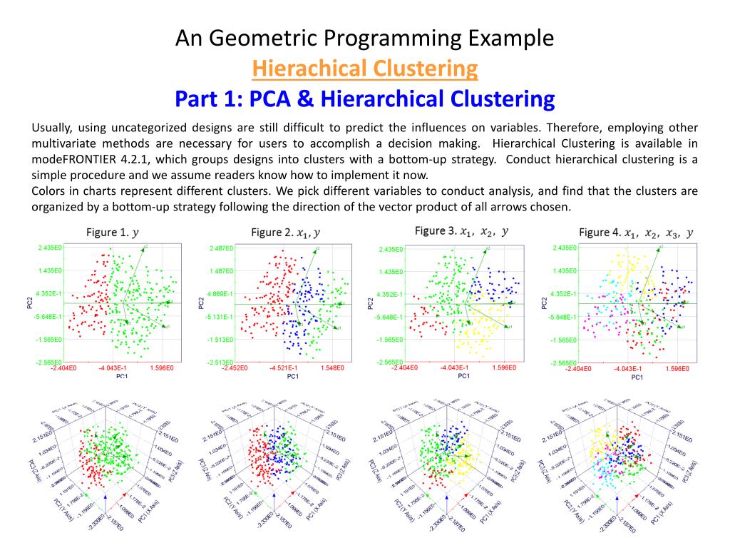 An Geometric Programming ExampleHierachical ClusteringPart 1: PCA & Hierarchical Clustering Usually, using uncategorized designs are still difficult to predict the influences on variables. Therefore, employing other multivariate methods are necessary for users to accomplish a decision making. Hierarchical Clustering is available in modeFRONTIER 4.2.1, which groups designs into clusters with a bottom-up strategy. Conduct hierarchical clustering is a simple procedure and we assume readers know how to implement it now. Colors in charts represent different clusters. We pick different variables to conduct analysis, and find that the clusters are organized by a bottom-up strategy following the direction of the vector product of all arrows chosen.