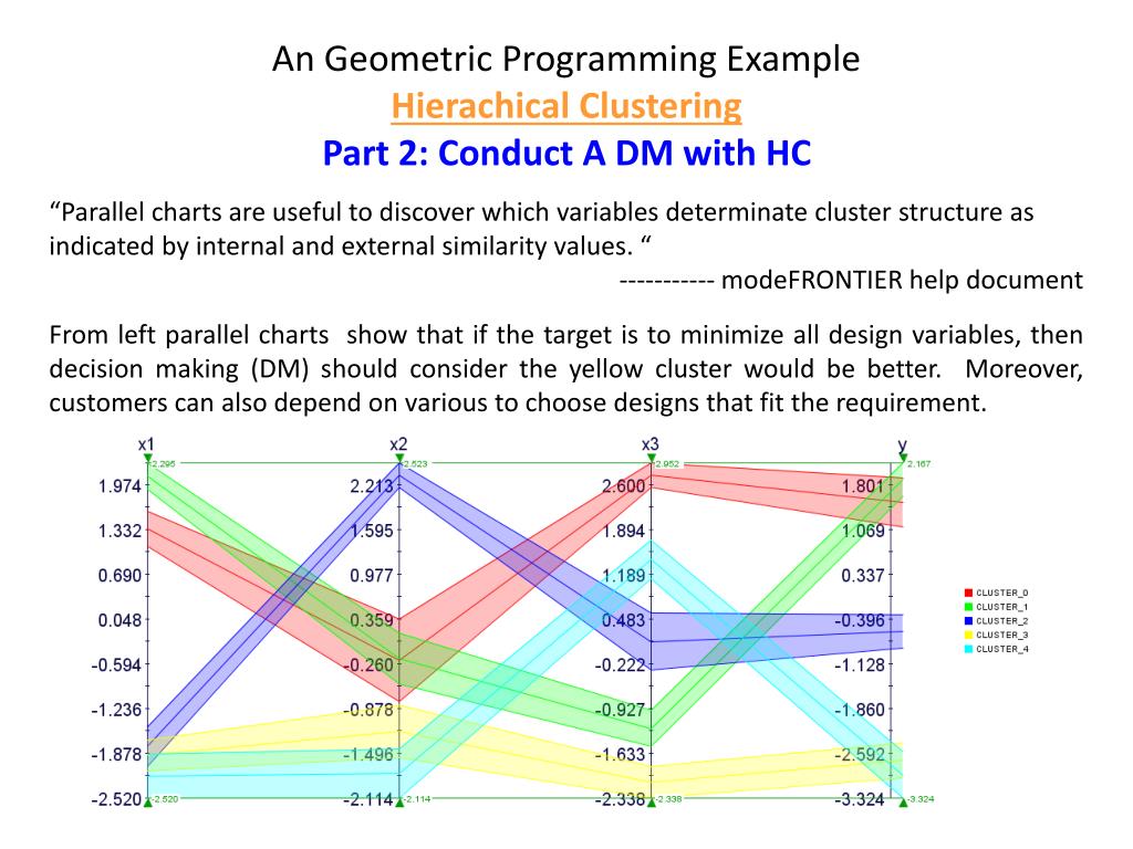 An Geometric Programming ExampleHierachical ClusteringPart 2: Conduct A DM with HC “Parallel charts are useful to discover which variables determinate cluster structure as indicated by internal and external similarity values. “ ----------- modeFRONTIER help document From left parallel charts show that if the target is to minimize all design variables, then decision making (DM) should consider the yellow cluster would be better. Moreover, customers can also depend on various to choose designs that fit the requirement.