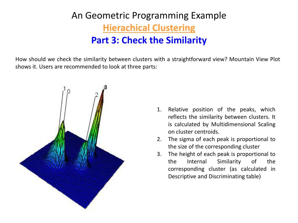 An Geometric Programming ExampleHierachical ClusteringPart 3: Check the Similarity How should we check the similarity between clusters with a straightforward view? Mountain View Plot shows it. Users are recommended to look at three parts: Relative position of the peaks, which reflects the similarity between clusters. It is calculated by Multidimensional Scaling on cluster centroids. The sigma of each peak is proportional to the size of the corresponding cluster The height of each peak is proportional to the Internal Similarity of the corresponding cluster (as calculated in Descriptive and Discriminating table)