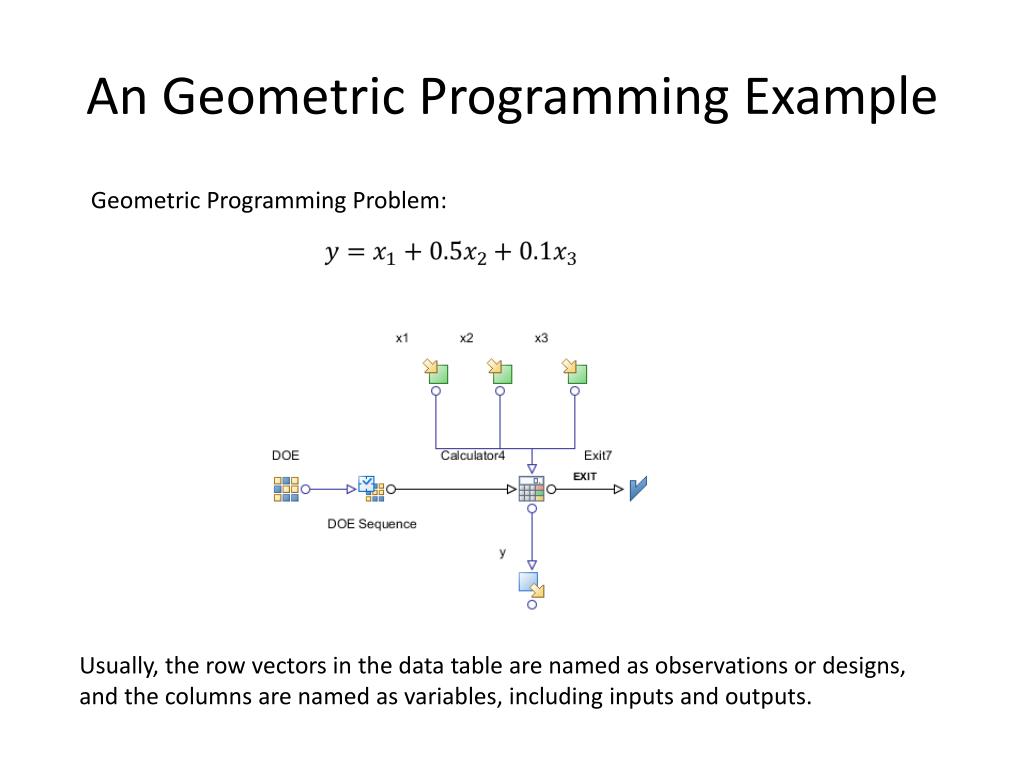 An Geometric Programming Example Geometric Programming Problem: Usually, the row vectors in the data table are named as observations or designs, and the columns are named as variables, including inputs and outputs.