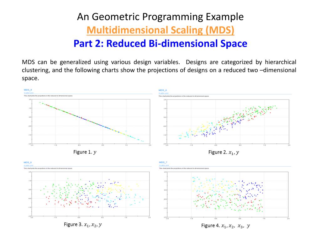 An Geometric Programming ExampleMultidimensional Scaling (MDS)Part 2: Reduced Bi-dimensional Space MDS can be generalized using various design variables. Designs are categorized by hierarchical clustering, and the following charts show the projections of designs on a reduced two –dimensional space.