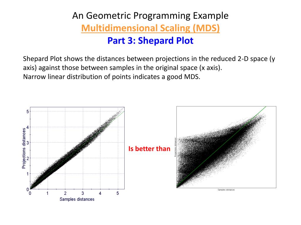 An Geometric Programming ExampleMultidimensional Scaling (MDS)Part 3: Shepard Plot Shepard Plot shows the distances between projections in the reduced 2-D space (y axis) against those between samples in the original space (x axis). Narrow linear distribution of points indicates a good MDS. Is better than