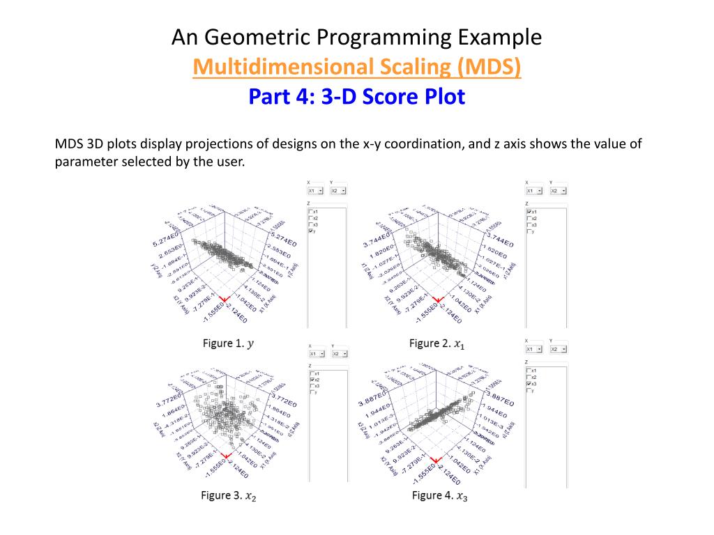 An Geometric Programming ExampleMultidimensional Scaling (MDS)Part 4: 3-D Score Plot MDS 3D plots display projections of designs on the x-y coordination, and z axis shows the value of parameter selected by the user.