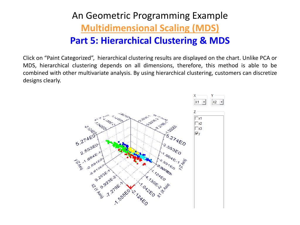 An Geometric Programming ExampleMultidimensional Scaling (MDS)Part 5: Hierarchical Clustering & MDS Click on “Paint Categorized”, hierarchical clustering results are displayed on the chart. Unlike PCA or MDS, hierarchical clustering depends on all dimensions, therefore, this method is able to be combined with other multivariate analysis. By using hierarchical clustering, customers can discretize designs clearly.
