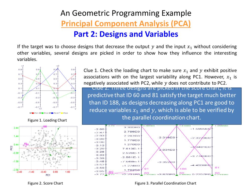 An Geometric Programming ExamplePrincipal Component Analysis (PCA)Part 2: Designs and Variables Figure 1. Loading Chart Figure 2. Score Chart Figure 3. Parallel Coordination Chart