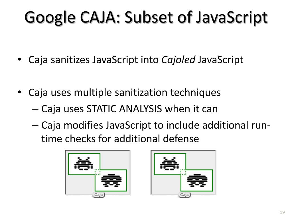 Google CAJA: Subset of JavaScript 19 • Caja sanitizes JavaScript into Cajoled JavaScript • Caja uses multiple sanitization techniques • Caja uses STATIC ANALYSIS when it can • Caja modifies JavaScript to include additional run-time checks for additional defense