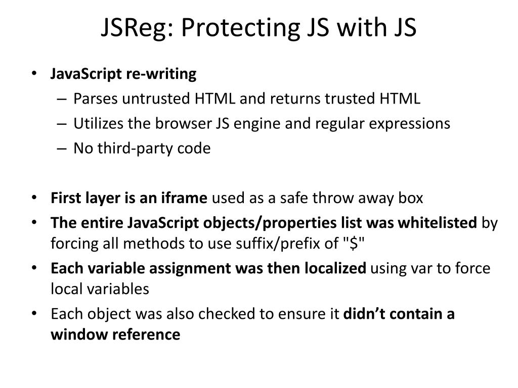 JSReg: Protecting JS with JS JavaScript re-writing Parses untrusted HTML and returns trusted HTML Utilizes the browser JS engine and regular expressions No third-party code First layer is an iframe used as a safe throw away box The entire JavaScript objects/properties list was whitelisted by forcing all methods to use suffix/prefix of "$" Each variable assignment was then localized using var to force local variables Each object was also checked to ensure it didn’t contain a window reference