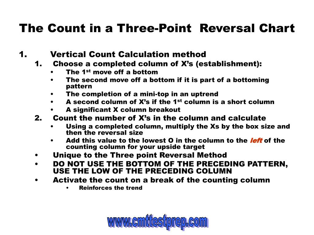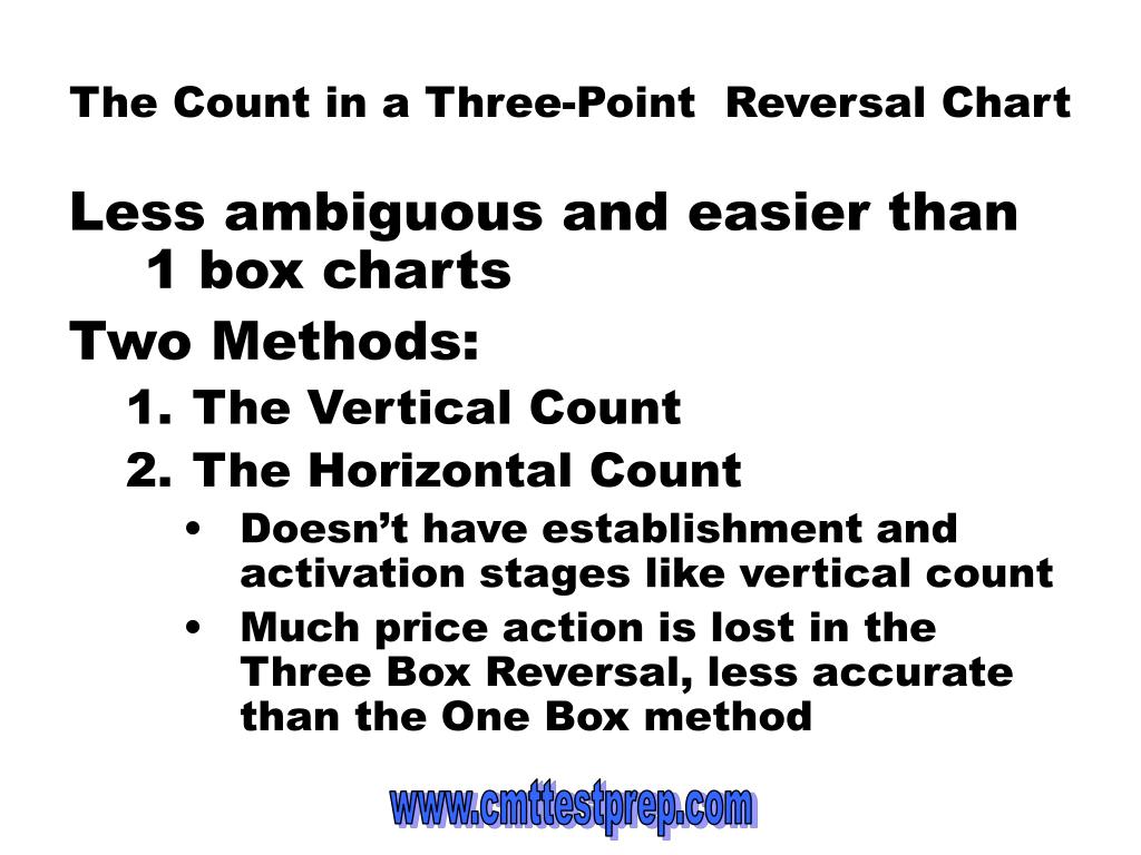 The Count in a Three-Point Reversal Chart Less ambiguous and easier than 1 box charts Two Methods: • The Vertical Count • The Horizontal Count • Doesn’t have establishment and activation stages like vertical count • Much price action is lost in the Three Box Reversal, less accurate than the One Box method