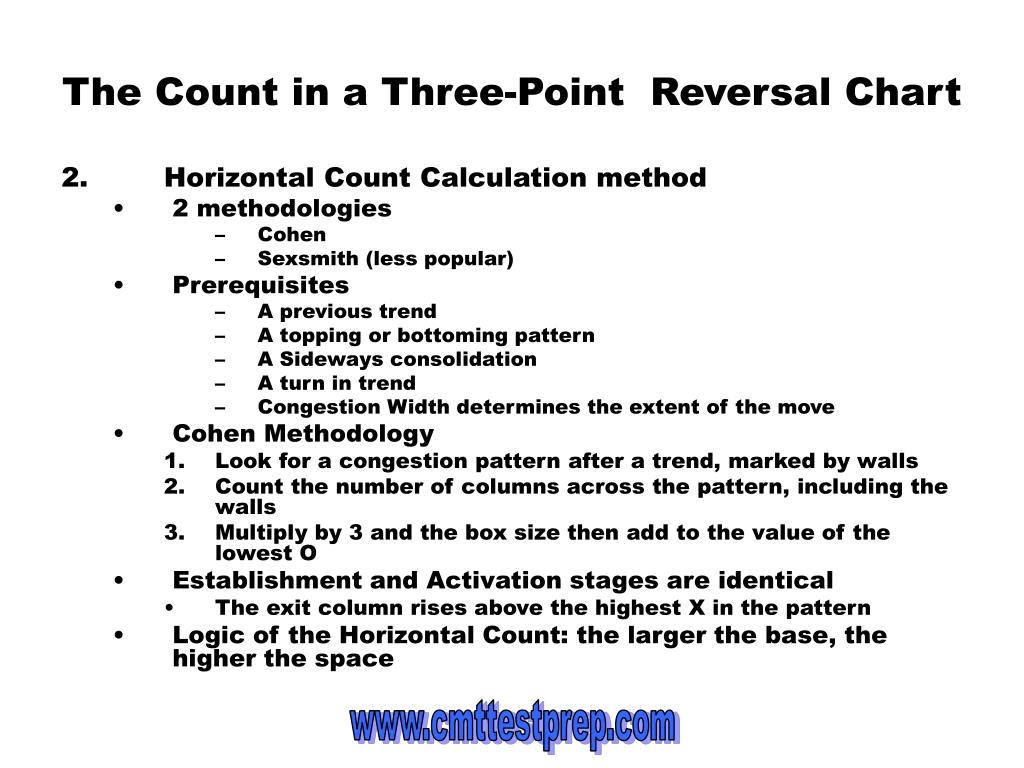 The Count in a Three-Point Reversal Chart 2. Horizontal Count Calculation method • 2 methodologies • Cohen • Sexsmith (less popular) • Prerequisites • A previous trend • A topping or bottoming pattern • A Sideways consolidation • A turn in trend • Congestion Width determines the extent of the move • Cohen Methodology • Look for a congestion pattern after a trend, marked by walls • Count the number of columns across the pattern, including the walls • Multiply by 3 and the box size then add to the value of the lowest O • Establishment and Activation stages are identical • The exit column rises above the highest X in the pattern • Logic of the Horizontal Count: the larger the base, the higher the space