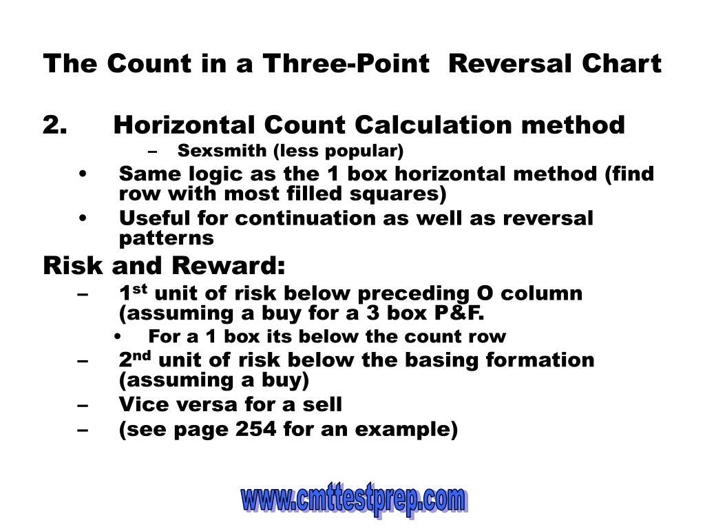 The Count in a Three-Point Reversal Chart 2. Horizontal Count Calculation method • Sexsmith (less popular) • Same logic as the 1 box horizontal method (find row with most filled squares) • Useful for continuation as well as reversal patterns Risk and Reward: • 1st unit of risk below preceding O column (assuming a buy for a 3 box P&F. • For a 1 box its below the count row • 2nd unit of risk below the basing formation (assuming a buy) • Vice versa for a sell • (see page 254 for an example)