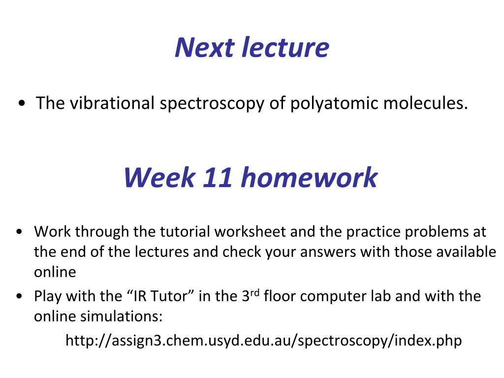 Next lecture The vibrational spectroscopy of polyatomic molecules. Week 11 homework • Work through the tutorial worksheet and the practice problems at the end of the lectures and check your answers with those available online • Play with the “IR Tutor” in the 3rd floor computer lab and with the online simulations: • http://assign3.chem.usyd.edu.au/spectroscopy/index.php
