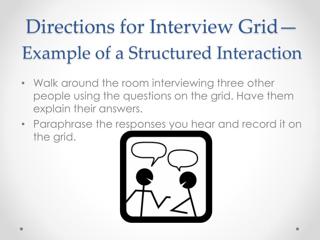 Directions for Interview Grid—Example of a Structured Interaction • Walk around the room interviewing three other people using the questions on the grid. Have them explain their answers. • Paraphrase the responses you hear and record it on the grid.