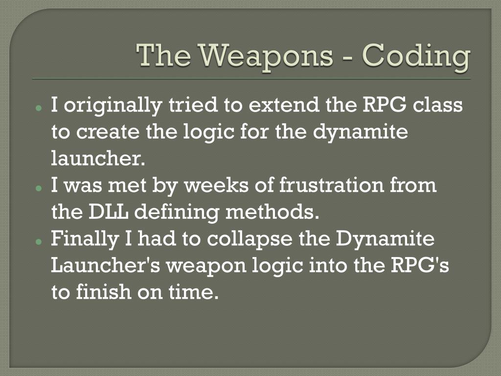 The Weapons - Coding • I originally tried to extend the RPG class to create the logic for the dynamite launcher. • I was met by weeks of frustration from the DLL defining methods. • Finally I had to collapse the Dynamite Launcher's weapon logic into the RPG's to finish on time.