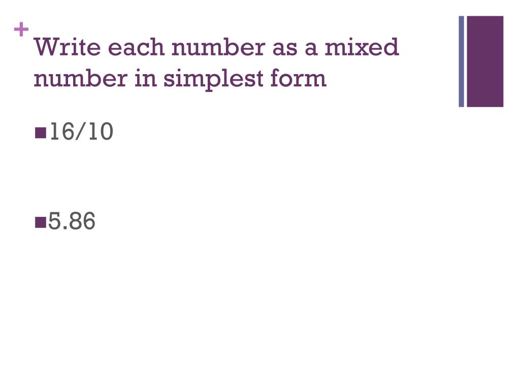 Write each number as a mixed number in simplest form • 16/10 • 5.86