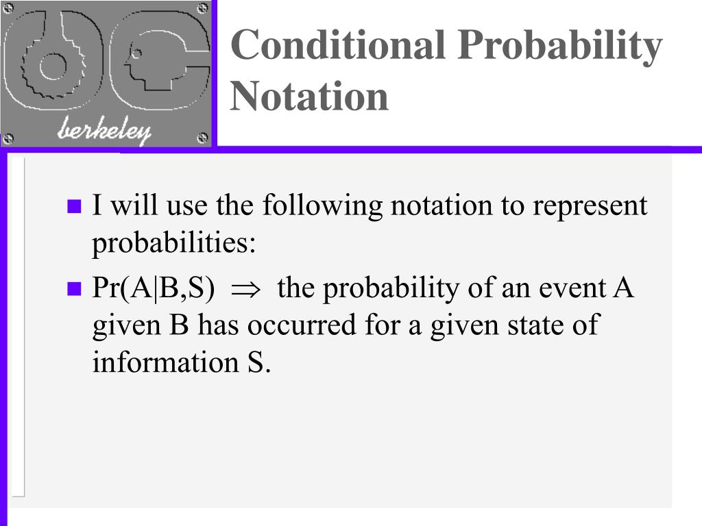 Conditional Probability Notation • I will use the following notation to represent probabilities: • Pr(A|B,S) Þ the probability of an event A given B has occurred for a given state of information S.