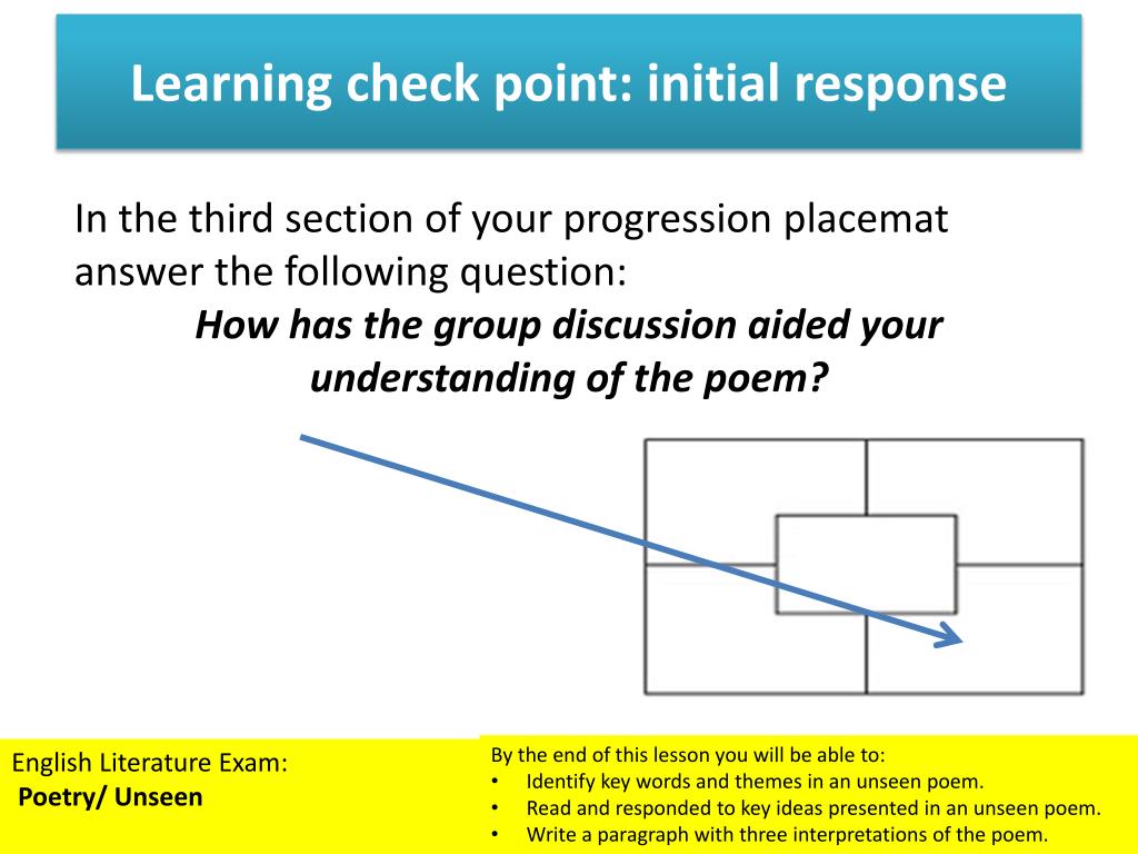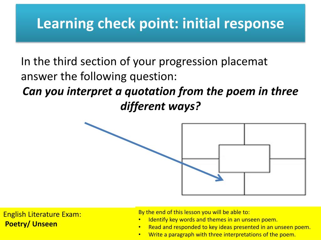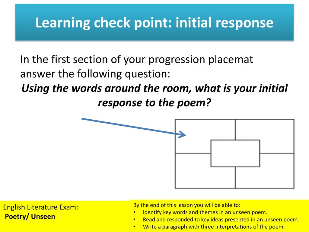 Learning check point: initial response In the first section of your progression placemat answer the following question: Using the words around the room, what is your initial response to the poem? • By the end of this lesson you will be able to: • Identify key words and themes in an unseen poem. • Read and responded to key ideas presented in an unseen poem. • Write a paragraph with three interpretations of the poem. English Literature Exam: Poetry/ Unseen