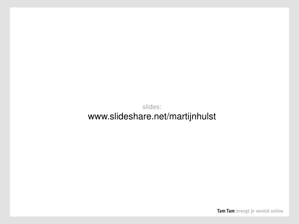 Martijn Hulst, martijn.hulst@tamtam.nl, 2010Deze presentatie is mede mogelijkheid door verschillende webloggers, Flickr-gebruikers, Sxc.hu-publiceerders, Wikipedia-schrijvers, Slideshare-delers, Twitteraars. etc. Zonder de verschillende gedeelde berichten, foto’s en presentaties was het maken van deze presentatie onmogelijk.Heel veel dank en laten we blijven delen.