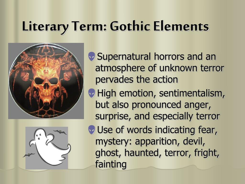 Literary Term: Gothic Elements • Supernatural horrors and an atmosphere of unknown terror pervades the action • High emotion, sentimentalism, but also pronounced anger, surprise, and especially terror • Use of words indicating fear, mystery: apparition, devil, ghost, haunted, terror, fright, fainting