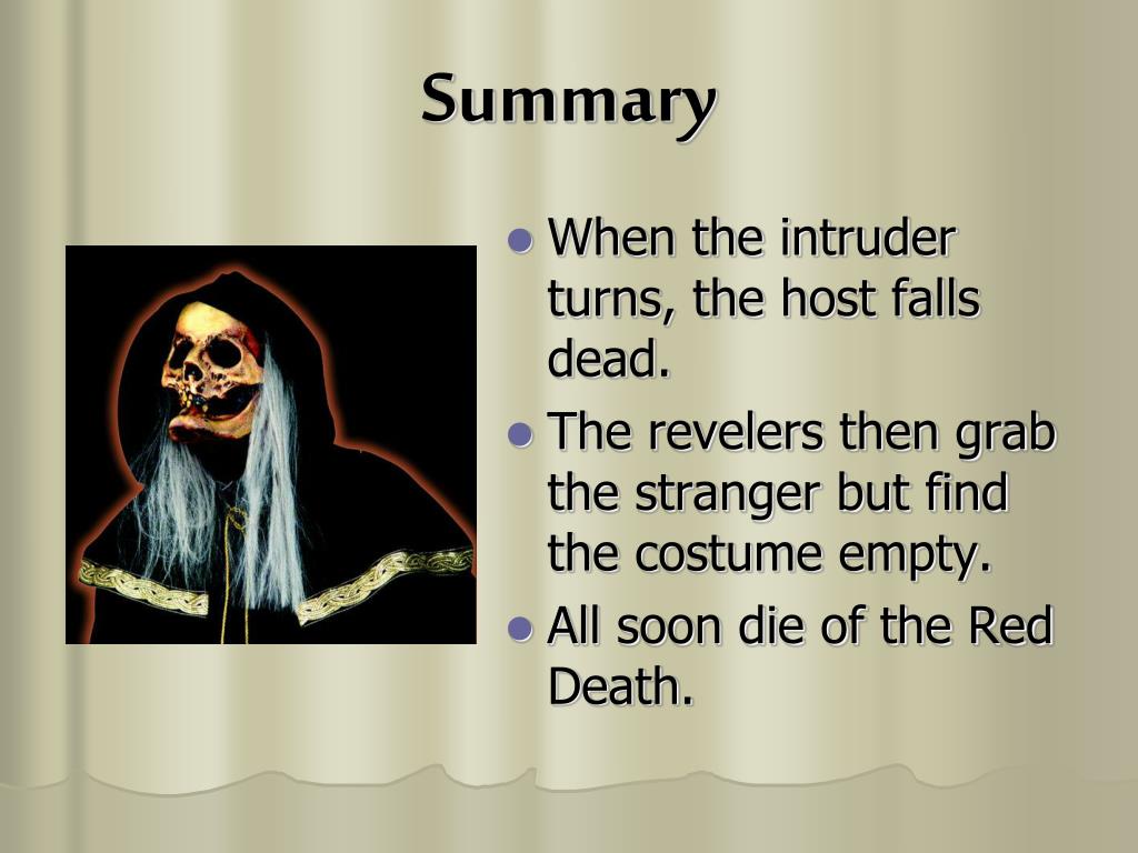 Summary • When the intruder turns, the host falls dead. • The revelers then grab the stranger but find the costume empty. • All soon die of the Red Death.
