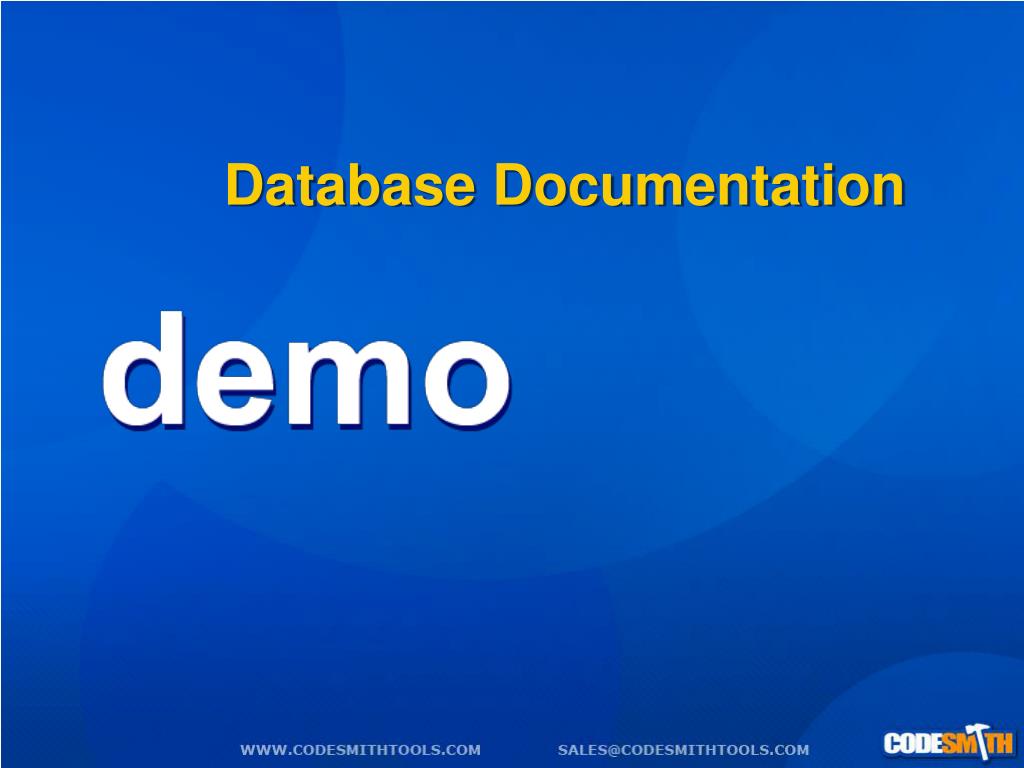 Database Documentation • DbDocumenter Templates (master.cst) • Set basic information and run batch file • Ex, database connection and title • Great demo of CodeSmith capabilities • Simple repetitive problem • Would take weeks to create manually • Demonstrates CodeSmith “best practices” • Additional ideas… • Modify templates to generate ASP.NET • Generate .CHM help files • Add execute capabilities, etc.