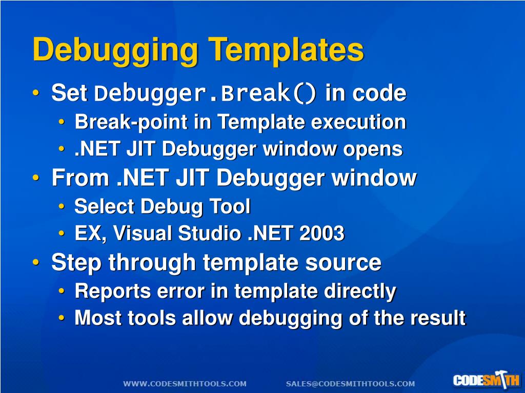 Debugging Templates • Set Debugger.Break() in code • Break-point in Template execution • .NET JIT Debugger window opens • From .NET JIT Debugger window • Select Debug Tool • EX, Visual Studio .NET 2003 • Step through template source • Reports error in template directly • Most tools allow debugging of the result