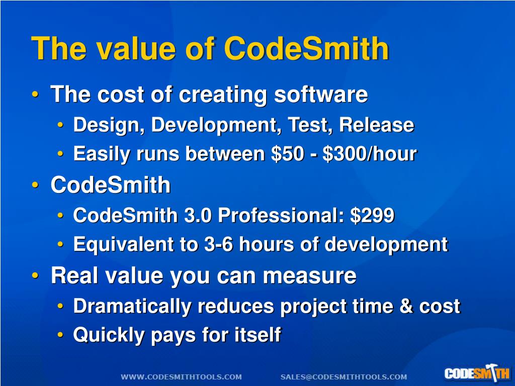 The value of CodeSmith • The cost of creating software • Design, Development, Test, Release • Easily runs between $50 - $300/hour • CodeSmith • CodeSmith 3.0 Professional: $299 • Equivalent to 3-6 hours of development • Real value you can measure • Dramatically reduces project time & cost • Quickly pays for itself