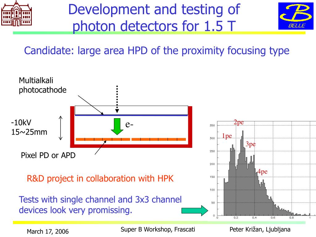 2pe Multialkali photocathode 1pe 3pe 4pe e- -10kV 15~25mm Pixel PD or APD Development and testing of photon detectors for 1.5T Candidate: large area HPD of the proximity focusing type R&D project in collaboration with HPK Tests with single channel and 3x3 channel devices look very promissing. Super B Workshop, Frascati