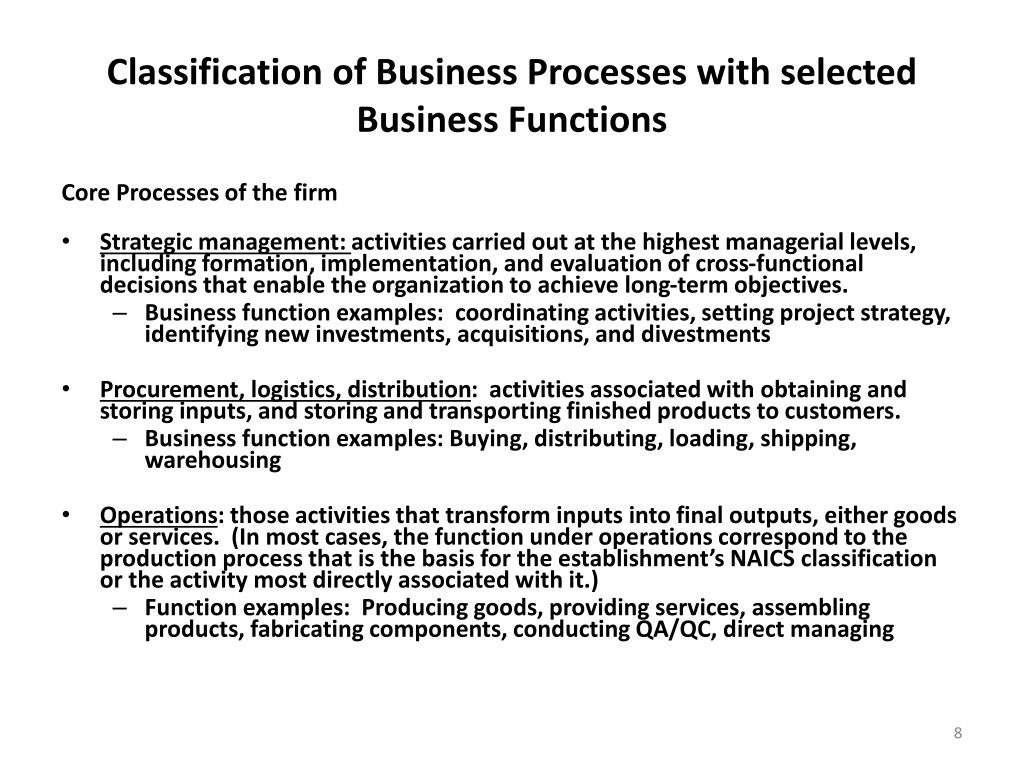 Classification of Business Processes with selected Business Functions Core Processes of the firm • Strategic management: activities carried out at the highest managerial levels, including formation, implementation, and evaluation of cross-functional decisions that enable the organization to achieve long-term objectives. • Business function examples: coordinating activities, setting project strategy, identifying new investments, acquisitions, and divestments • Procurement, logistics, distribution: activities associated with obtaining and storing inputs, and storing and transporting finished products to customers. • Business function examples: Buying, distributing, loading, shipping, warehousing • Operations: those activities that transform inputs into final outputs, either goods or services. (In most cases, the function under operations correspond to the production process that is the basis for the establishment’s NAICS classification or the activity most directly associated with it.) • Function examples: Producing goods, providing services, assembling products, fabricating components, conducting QA/QC, direct managing