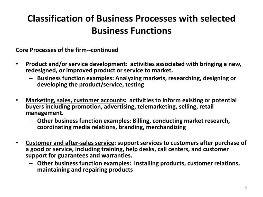 Classification of Business Processes with selected Business Functions Core Processes of the firm--continued • Product and/or service development: activities associated with bringing a new, redesigned, or improved product or service to market. • Business function examples: Analyzing markets, researching, designing or developing the product/service, testing • Marketing, sales, customer accounts: activities to inform existing or potential buyers including promotion, advertising, telemarketing, selling, retail management. • Other business function examples: Billing, conducting market research, coordinating media relations, branding, merchandizing • Customer and after-sales service: support services to customers after purchase of a good or service, including training, help desks, call centers, and customer support for guarantees and warranties. • Other business function examples: Installing products, customer relations, maintaining and repairing products