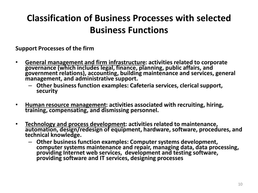 Classification of Business Processes with selected Business Functions Support Processes of the firm • General management and firm infrastructure: activities related to corporate governance (which includes legal, finance, planning, public affairs, and government relations), accounting, building maintenance and services, general management, and administrative support. • Other business function examples: Cafeteria services, clerical support, security • Human resource management: activities associated with recruiting, hiring, training, compensating, and dismissing personnel. • Technology and process development: activities related to maintenance, automation, design/redesign of equipment, hardware, software, procedures, and technical knowledge. • Other business function examples: Computer systems development, computer systems maintenance and repair, managing data, data processing, providing Internet web services, development and testing software, providing software and IT services, designing processes