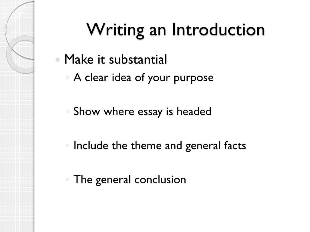 Writing an Introduction • Make it substantial • A clear idea of your purpose • Show where essay is headed • Include the theme and general facts • The general conclusion