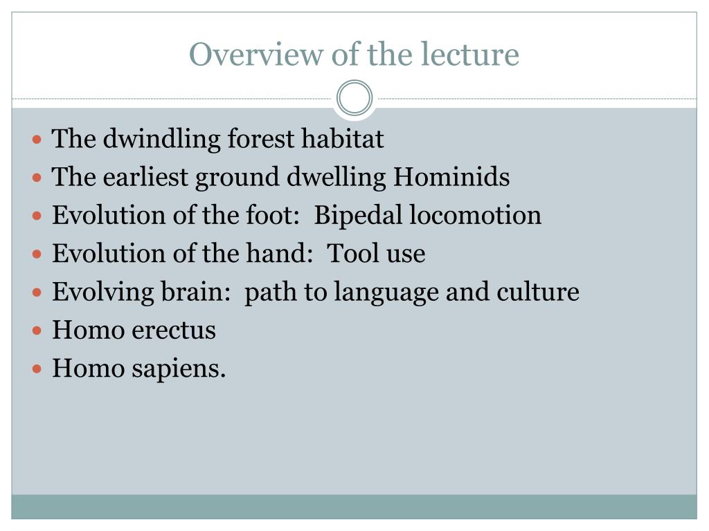 Overview of the lecture • The dwindling forest habitat • The earliest ground dwelling Hominids • Evolution of the foot: Bipedal locomotion • Evolution of the hand: Tool use • Evolving brain: path to language and culture • Homo erectus • Homo sapiens.
