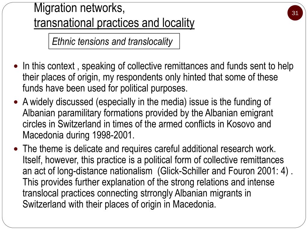 Migration networks, transnational practices and locality Ethnic tensions and translocality • In this context , speaking of collective remittances and funds sent to help their places of origin, my respondents only hinted that some of these funds have been used for political purposes. • A widely discussed (especially in the media) issue is the funding of Albanian paramilitary formations provided by the Albanian emigrant circles in Switzerland in times of the armed conflicts in Kosovo and Macedonia during 1998-2001. • The theme is delicate and requires careful additional research work. Itself, however, this practice is a political form of collective remittances an act of long-distance nationalism (Glick-Schiller and Fouron 2001: 4) . This provides further explanation of the strong relations and intense translocal practices connecting strrongly Albanian migrants in Switzerland with their places of origin in Macedonia.