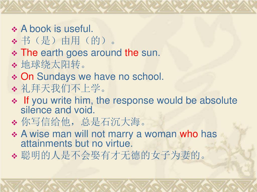 A book is useful. • 书(是)由用(的)。 • The earth goes around the sun. • 地球绕太阳转。 • On Sundays we have no school. • 礼拜天我们不上学。 • If you write him, the response would be absolute silence and void. • 你写信给他,总是石沉大海。 • A wise man will not marry a woman who has attainments but no virtue. • 聪明的人是不会娶有才无德的女子为妻的。