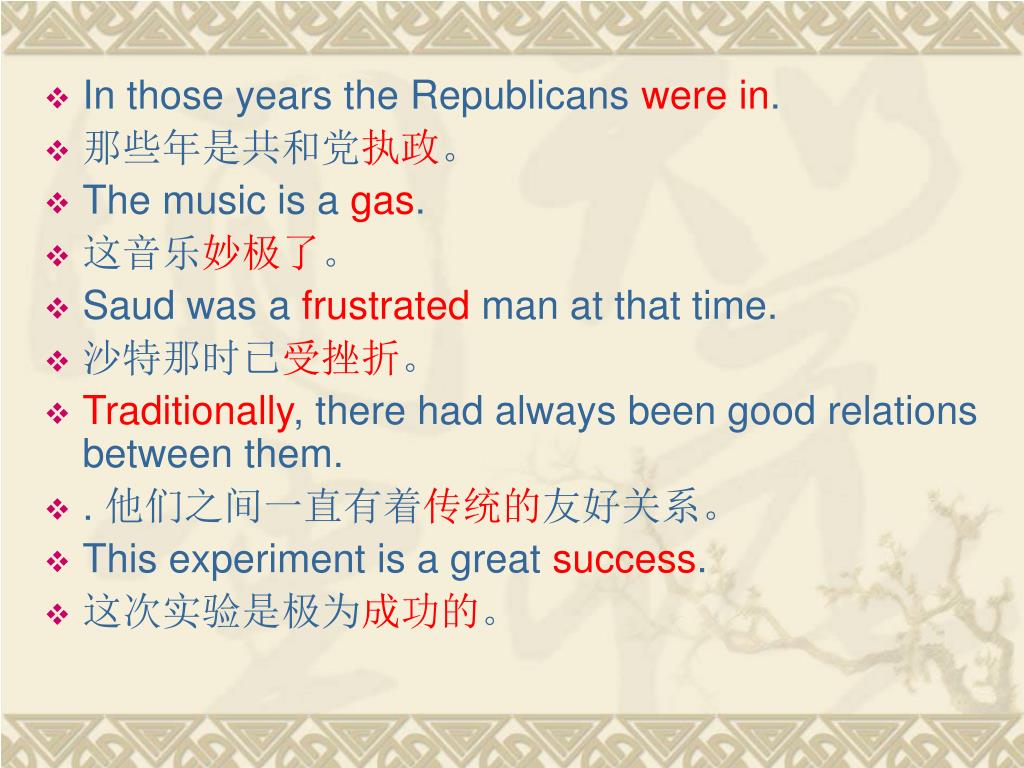 In those years the Republicans were in. • 那些年是共和党执政。 • The music is a gas. • 这音乐妙极了。 • Saud was a frustrated man at that time. • 沙特那时已受挫折。 • Traditionally, there had always been good relations between them. • . 他们之间一直有着传统的友好关系。 • This experiment is a great success. • 这次实验是极为成功的。