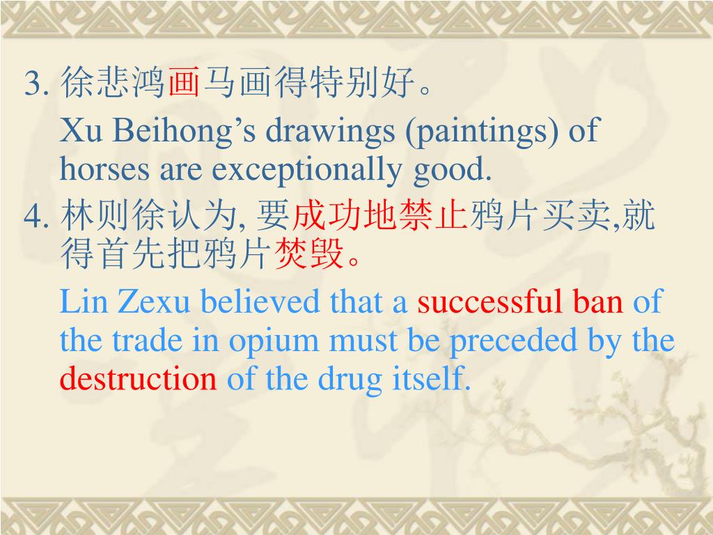 3. 徐悲鸿画马画得特别好。 Xu Beihong’s drawings (paintings) of horses are exceptionally good. 4. 林则徐认为, 要成功地禁止鸦片买卖,就得首先把鸦片焚毁。 Lin Zexu believed that a successful ban of the trade in opium must be preceded by the destruction of the drug itself.