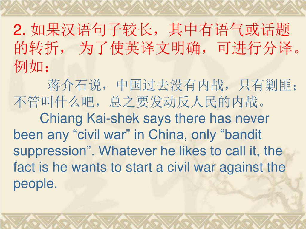2. 如果汉语句子较长,其中有语气或话题的转折, 为了使英译文明确,可进行分译。例如: 蒋介石说,中国过去没有内战,只有剿匪;不管叫什么吧,总之要发动反人民的内战。 Chiang Kai-shek says there has never been any “civil war” in China, only “bandit suppression”. Whatever he likes to call it, the fact is he wants to start a civil war against the people.