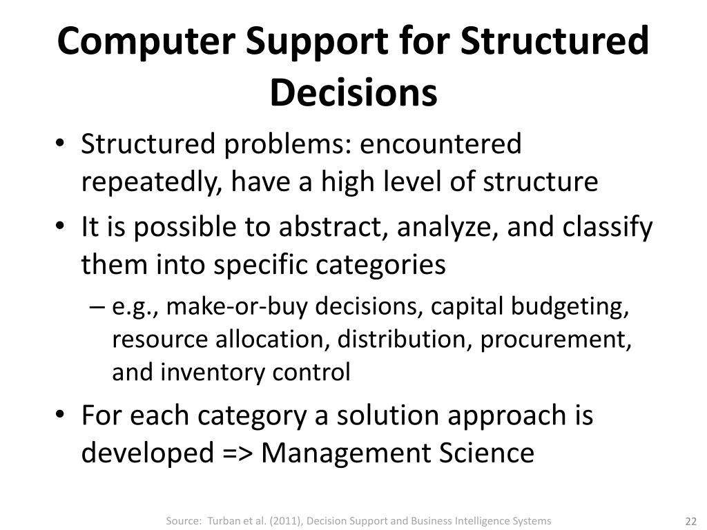 Computer Support for Structured Decisions • Structured problems: encountered repeatedly, have a high level of structure • It is possible to abstract, analyze, and classify them into specific categories • e.g., make-or-buy decisions, capital budgeting, resource allocation, distribution, procurement, and inventory control • For each category a solution approach is developed => Management Science Source: Turban et al. (2011), Decision Support and Business Intelligence Systems