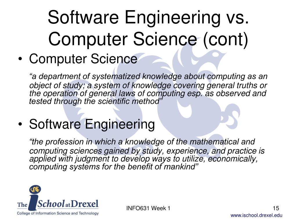 Software Engineering vs. Computer Science Software Engineering = Computer Science + Practice + Engineering Economy INFO631 Week 1