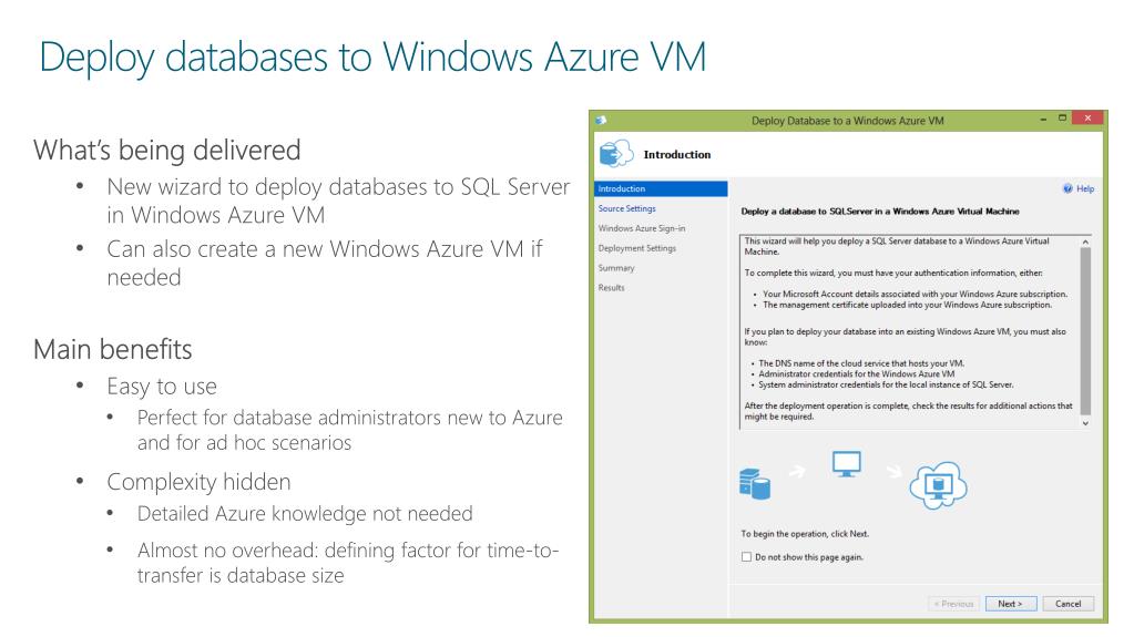 Deploy databases to Windows Azure VM • What’s being delivered • New wizard to deploy databases to SQL Server in Windows Azure VM • Can also create a new Windows Azure VM if needed • Main benefits • Easy to use • Perfect for database administrators new to Azure and for ad hoc scenarios • Complexity hidden • Detailed Azure knowledge not needed • Almost no overhead: defining factor for time-to-transfer is database size