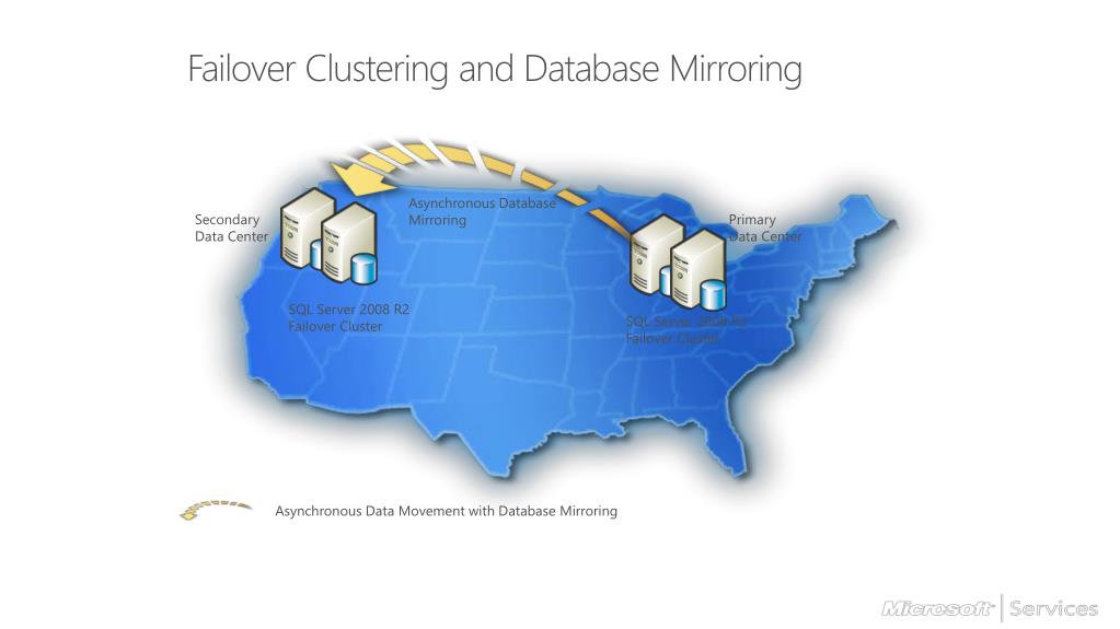 Failover Clustering and Database Mirroring Asynchronous Database Mirroring Secondary Data Center Primary Data Center SQL Server 2008 R2 Failover Cluster SQL Server 2008 R2 Failover Cluster Asynchronous Data Movement with Database Mirroring