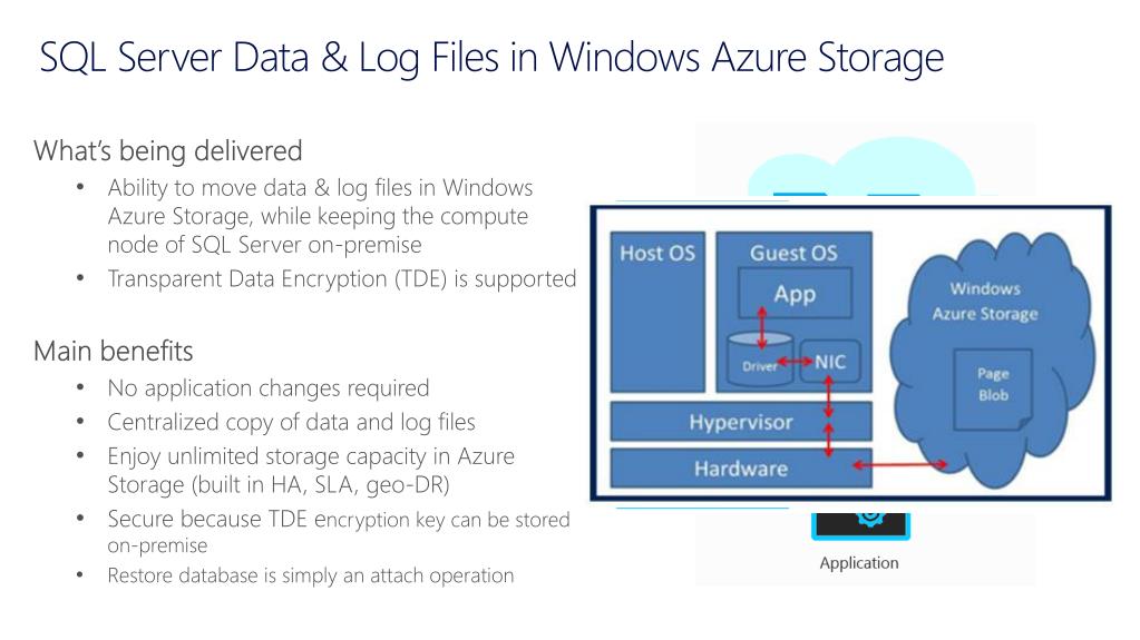 SQL Server Data & Log Files in Windows Azure Storage • What’s being delivered • Ability to move data & log files in Windows Azure Storage, while keeping the compute node of SQL Server on-premise • Transparent Data Encryption (TDE) is supported • Main benefits • No application changes required • Centralized copy of data and log files • Enjoy unlimited storage capacity in Azure Storage (built in HA, SLA, geo-DR) • Secure because TDE encryption key can be stored on-premise • Restore database is simply an attach operation